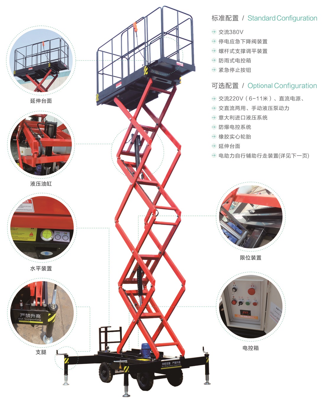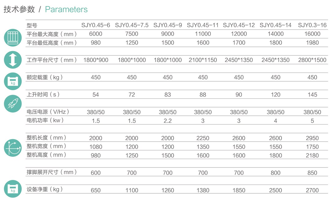 平臺(tái)最大高度規(guī)格:可選6m、7.5m、9m、11m、12m、14m、16m。